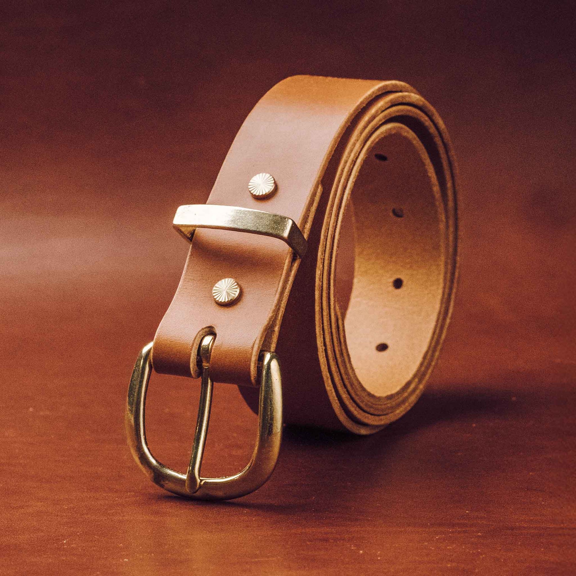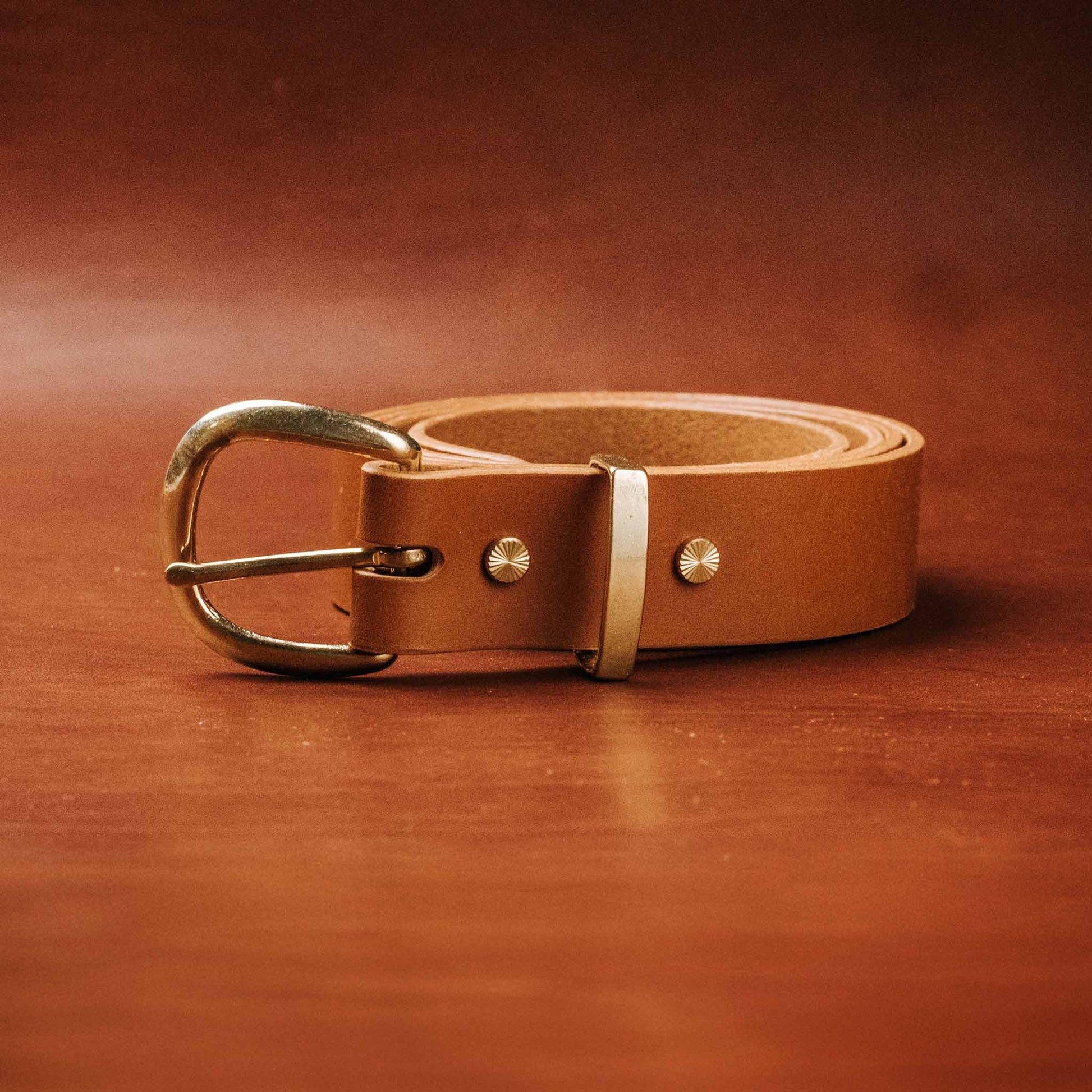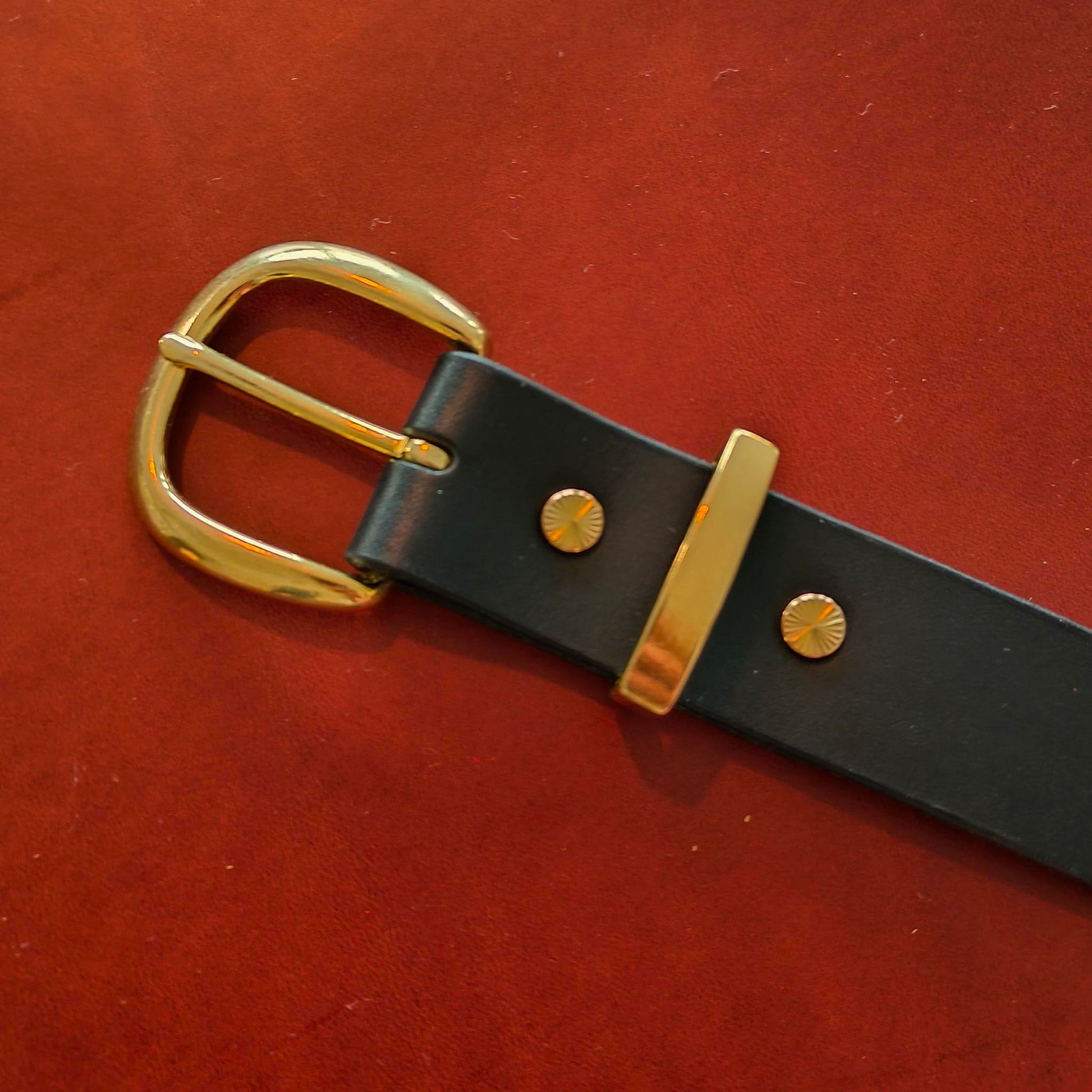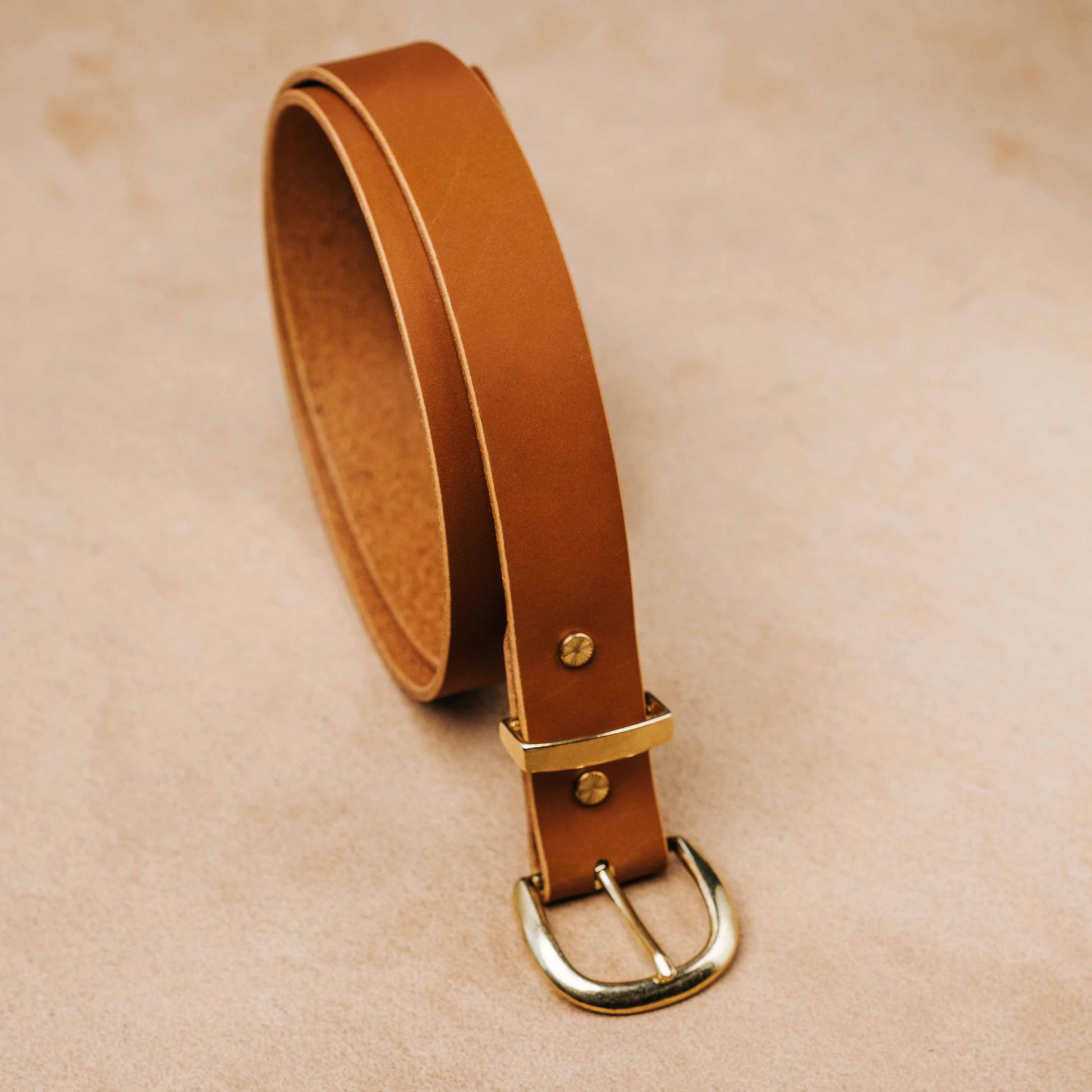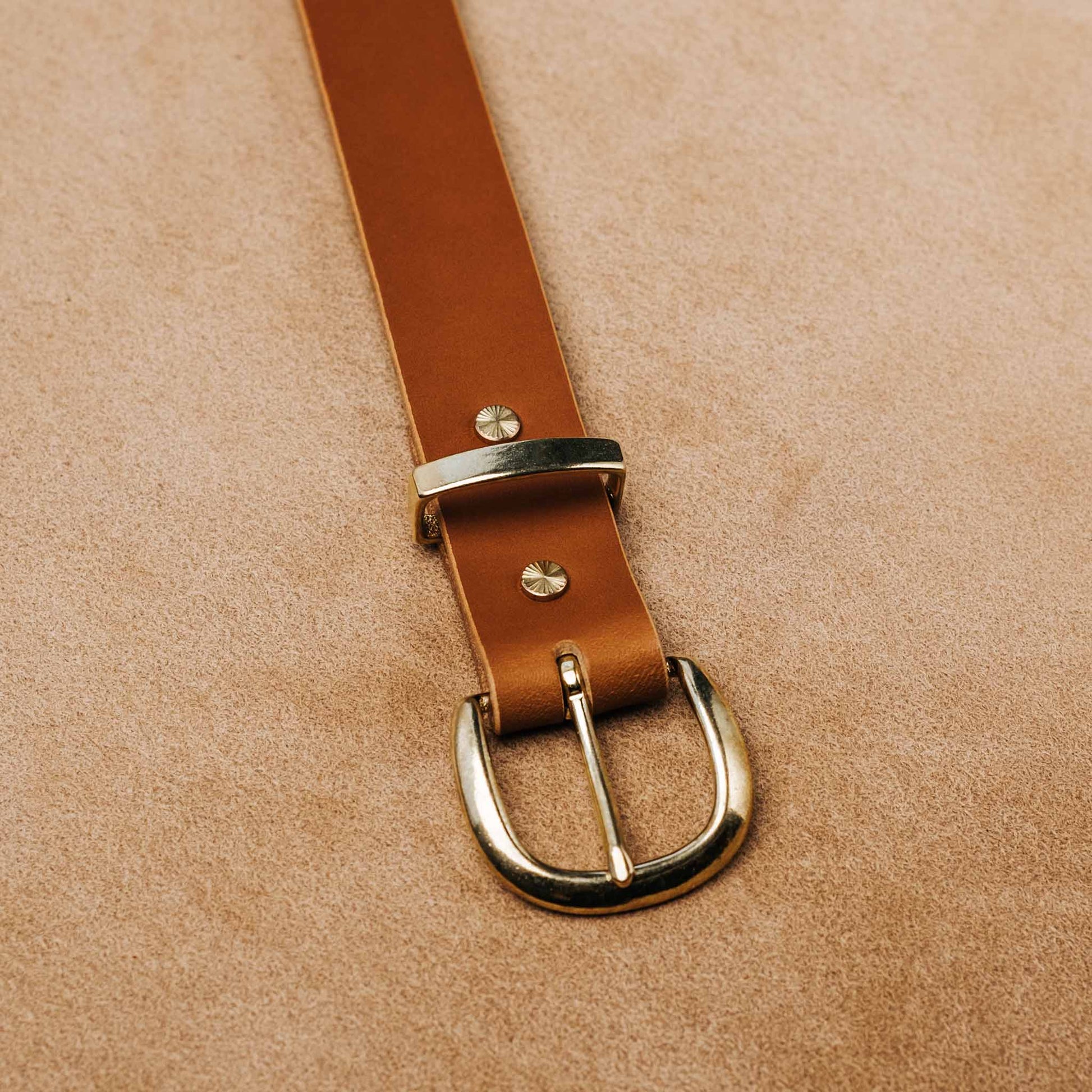Täysmessinkiset metalliosat – solki, lenkki ja niitit – viimeistelevät vyön laadukkaasti. Messinki ei ruostu ja sen lämmin sävy syvenee kauniisti käytön myötä.
