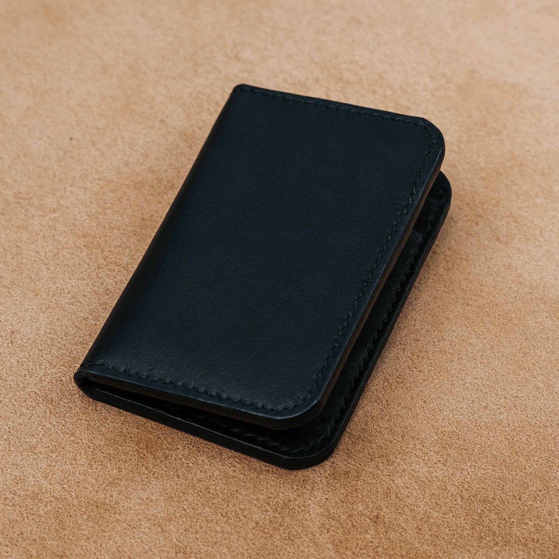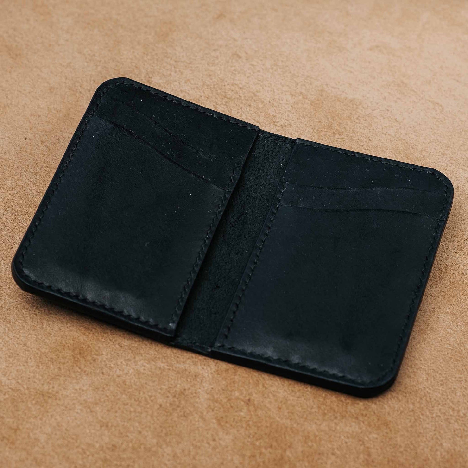 Tämä käsintehty musta nahkalompakko tarjoaa yksinkertaisen ja toimivan ratkaisun päivittäiseen käyttöön. Lompakossa on neljä korttipaikkaa, jotka pitävät tärkeimmät kortit helposti saatavilla, sekä kaksi erillistä taskua esimerkiksi seteleille, kuiteille tai lipuille. Selkeä rakenne tekee lompakosta kevyen ja mutkattoman käyttää.